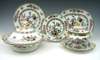 decorated with flowers, foliage and branches, comprising: six graduated ashets with scalloped borders, the largest 54cm wide; two comports and covers each with a gilt decorated acorn finial and leaf scroll handles, 29.5cm wide; a twin-handled sauce tureen, cover and stand; a footed twin-handled bowl, 32cm wide; nine meat plates; four fish plates; eight soup bowls; nine dessert bowls; and five side plates, most with red painted number 4713 and some with B.B. New Stone (49)
