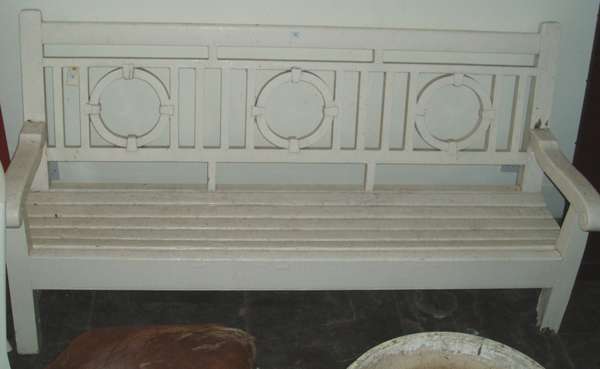 the rectangular slat-filled bench with three circular spaces, above scrolling open arms and slatted seat raised on square legs (some rot to leg terminators, the stretcher lacking)