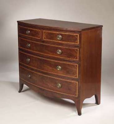 with boxwood and ebony stringing, the shaped top above two short over three long graduated drawers with outswept bracket feet