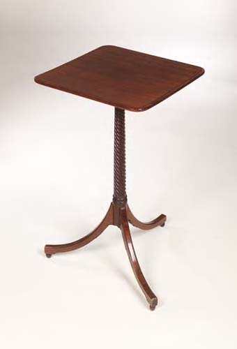 with crossbanded and ebony strung square top raised on spirally fluted column on tripod base with moulded edges on ball feet