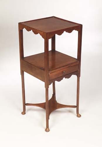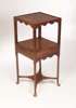 the square top above shaped apron above a lower tier with single drawer on turned supports linked by a shaped stretcher and terminating in pad feet