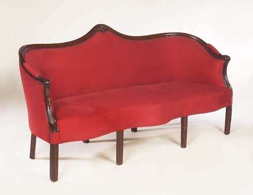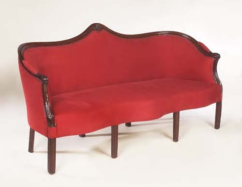 the serpentine back with rosette and husk swag carving within moulded frame enclosing upholstered back and arms, with scrolled terminals and moulded uprights, the serpentine upholstered seat raised on square moulded legs