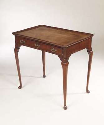 the rectangular tray top with rounded angles above a single drawer with beaded mouldings raised above slender cabriole legs terminating in pad feet