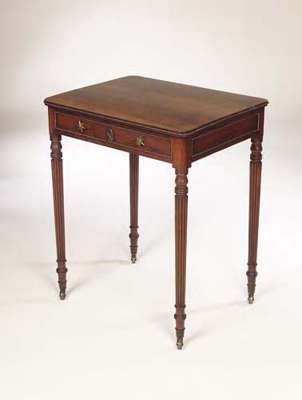 in the manner of Gillow & Co., the rectangular top with rounded angles and brass beading to the edge, above a single drawer with similar beading and applied anthemion escutcheon, the whole raised on turned tapering and reeded legs terminating in brass caps and castors