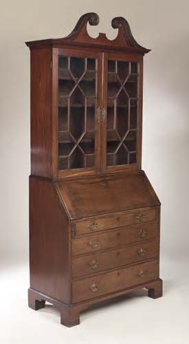 the dentilled swan neck pediment above astragal glazed doors enclosing adjustable shelves, raised on bureau with fall front enclosing fitted interior above four long graduated drawers and lopers, shaped bracket feet