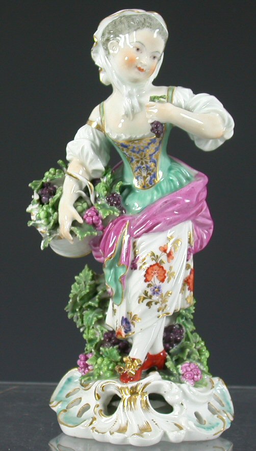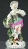 depicted as a boy wearing a pink flower-sprigged hat, green coat and flower decorated waistcoat with pale yellow breeches and red boots, holding a flower sprig, leaning against a bocage tree stump, on pierced rococo base