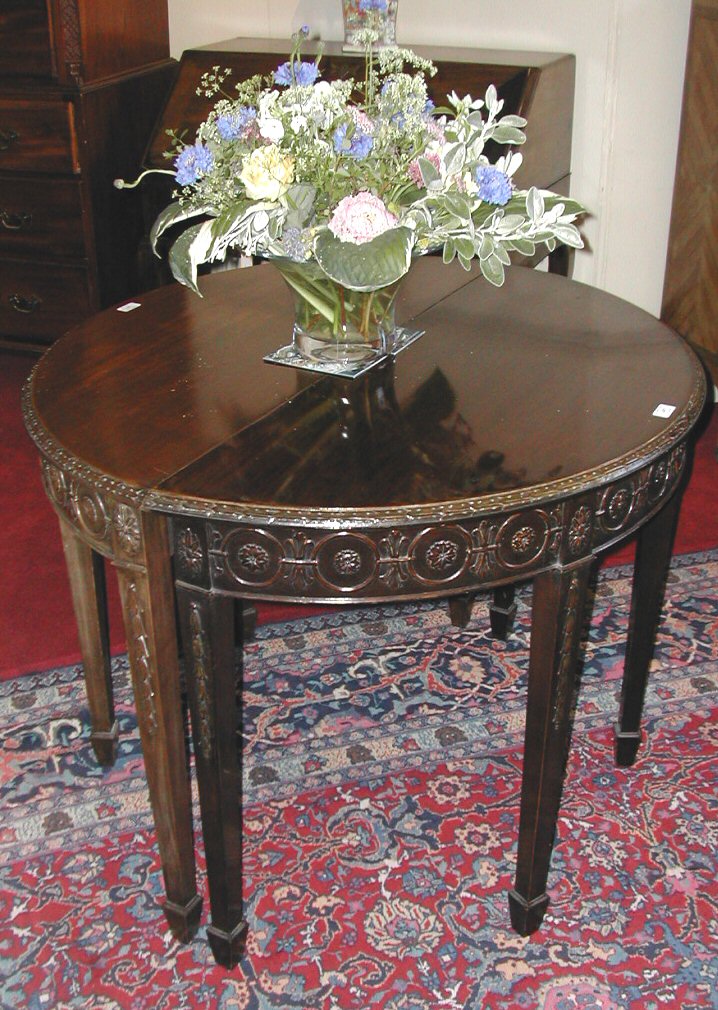 A pair of Edwardian mahogany demi lune tables,