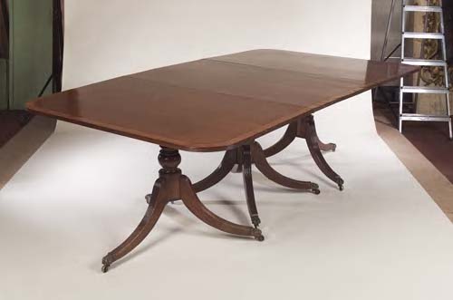 the rectangular top with rounded ends and reeded edge raised on triple pedestals, each with turned columns on quadruped base with reeded sabre legs terminating in cast paw caps and castors, includes two additional leaves
