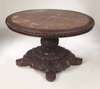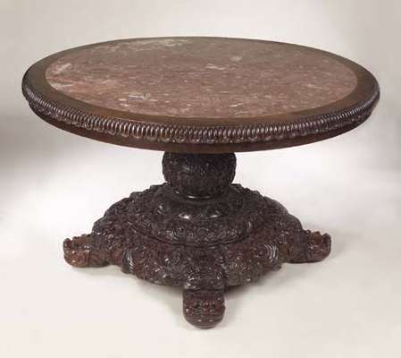 the circular top with rouge marble inset and carved beaded edge above a plain frieze on boldly turned column with spreading base, profusely carved with fruiting and flowering foliage, raised on carved paw