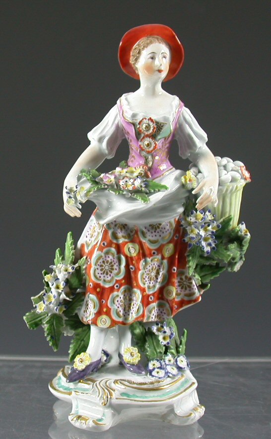 standing, dressed in a pink body and orange flower patterned skirt, with a posy in one hand and at her waist, with a basket of eggs under her other arm, beside a tree trunk sprouting flowers and foliage, on a rococo base
