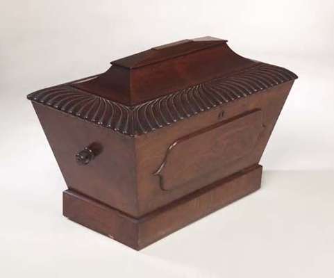 the caddy top with boldly gadrooned edge, opening to reveal a fitted interior, the canted sides with applied panel to the front and with applied handles to the sides (rings now lacking), the whole raised on a plinth