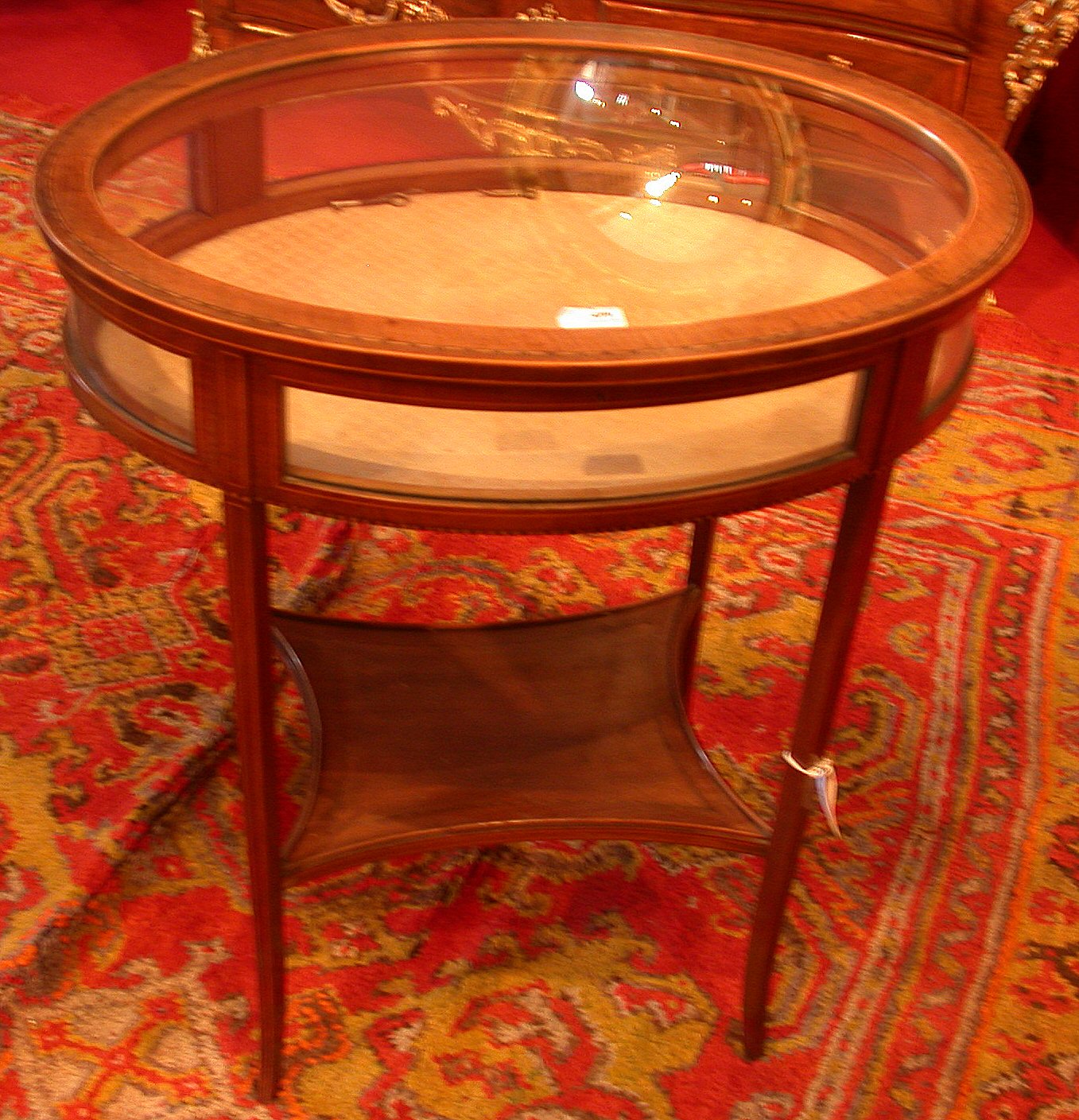 the oval glazed and hinged lid with silk-lined interior and with glazed panels to the sides, raised on square tapering legs, linked by a concave lower tier and with outswept feet