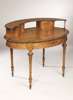 the oval top with raised superstructure, the crossbanded top above drawers and open voids, supported by turned columns and with gilt metal mounts, the crossbanded top with gilt metal mounted edge above panelled frieze with single drawer to the front, stamped 'Howard & Son, Berner St', the whole raised on turned and tapering fluted legs with toupie feet, terminating in brass castors