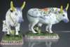 one with a milk maid, the other with a farm hand, seated by its back leg, on canted rectangular plinth, painted with flowers to the back, with a flower garland around the neck and with blue highlights to face, blue tail and blue spots, red painted monogram A/TH (2)