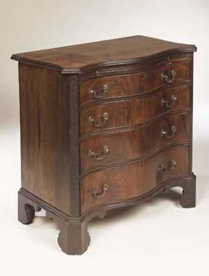 the shaped top with canted angles and moulded edge above a brushing slide and four long graduated drawers, flanked by blind fretwork angles and raised on shaped bracket feet