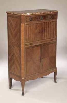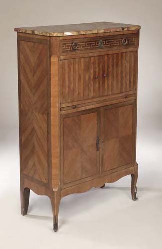 the Breche d'Alep rectangular marble top with rounded angles above Greek key inlaid frieze drawer and pair of faux tambour doors, with further pair of quarter veneered doors below, shaped apron and moulded feet with sabots, bears stamp 'Leon Geismar, Paris'