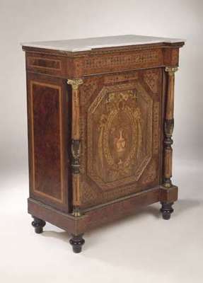 with gilt metal mounts, the rectangular marble top above a parquetry frieze and single panel door, profusely inlaid with a marquetry panel of an urn issuing flowers within a floral and foliate border, flanked by turned and fluted columns and raised above a plinth with turned feet