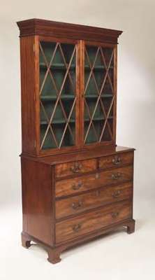 the projecting moulded cornice above twin astragal glazed doors raised on a chest base with two short over three long graduated drawers on bracket feet (top and bottom sections associated)