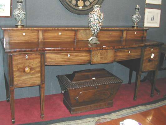with ebony stringing, the stage with two sliding doors above a semi bowed top and single entablature drawer, flanked by two further drawers and to the ends with deep fitted cellar drawers, the whole raised on square tapering legs, terminating in spade feet