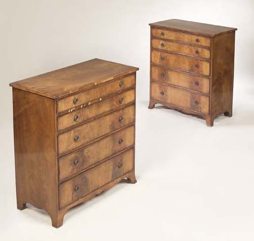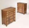of small proportions, each with ebony lines, the rectangular tops above five graduated drawers raised above outswept bracket feet (2)
