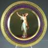 with textured gilt stiff leaf decoration to the rim, a border with stylised floral and foliate gilt decoration on a dark blue ground, the well framed with gilt border moulded with stylised flowers and painted with a full-length woman standing in classical dress of pale blue and pink silk, signed K Bauer, blue painted beehive mark and gilt painted "Tanz Bajadere" D 11