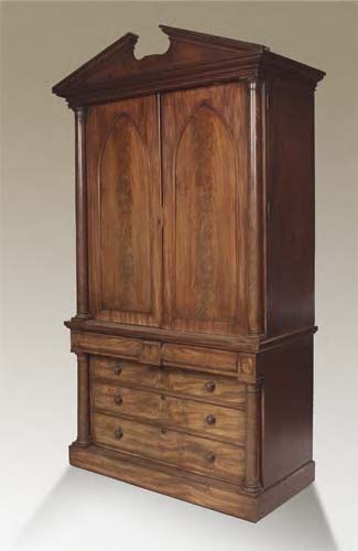 the projecting cornice with architectural pediment above twin doors with lancet arch panels enclosing sliding shelves, the base with ogee moulded frieze drawer and three long graduated drawers, flanked by columns and raised on a plinth