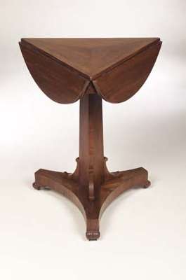 the circular top above a canted triangular section support on concave tripod base with scrolled brackets and scroll toe terminals