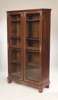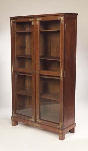 the moulded cornice above twin glazed doors, each with brass lines and applied leaf castings, enclosing adjustable sides, the whole raised on block feet