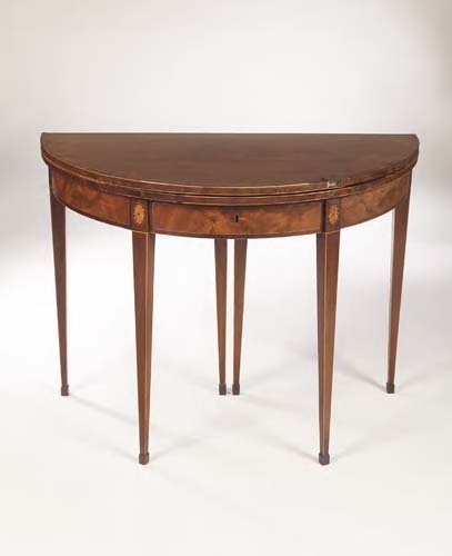 the demi-lune top above single drawer on square tapering legs with boxwood strung panels and fan paterae