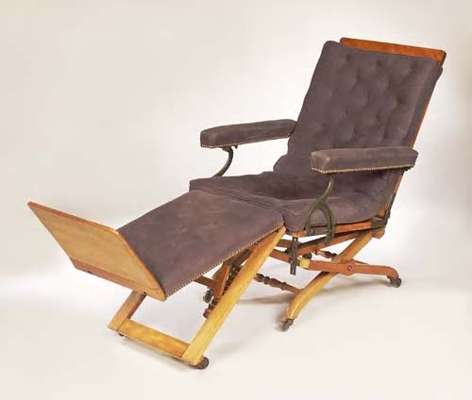 the rectangular top with loose buttoned squab cushion and brass adjusters above open arms and seat with loose buttoned squab cushion over a pull out upholstered footstool, the whole raised on cross supports with pot castors
