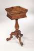 the hinged caddy top enclosing an interior fitted with two lidded caddies and two blue glass mixing bowls, the concave sides above moulded baluster columns on leaf carved tripod base