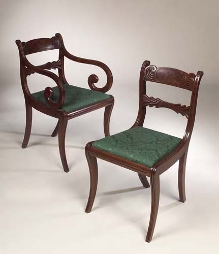 each with scroll-carved panelled top rails supported by reeded uprights and with shaped and gadrooned mid rail, the drop-in seat above reeded sabre legs, includes two carvers (8)