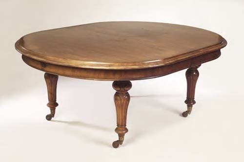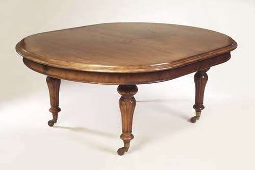 the rectangular top with rounded ends and heavily moulded edge above a plain frieze on turned and moulded tapering legs terminating in brass caps with pot castors, included three additional leaves