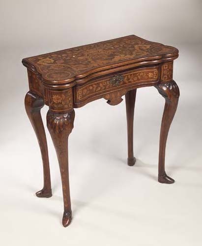 the shaped top with lobed angles, enclosing a baize lined interior with candle stands to the angles inlaid with playing cards, the shaped frieze with single drawer raised on shell-carved cabriole legs terminating in pad feet carved as buckled shoes