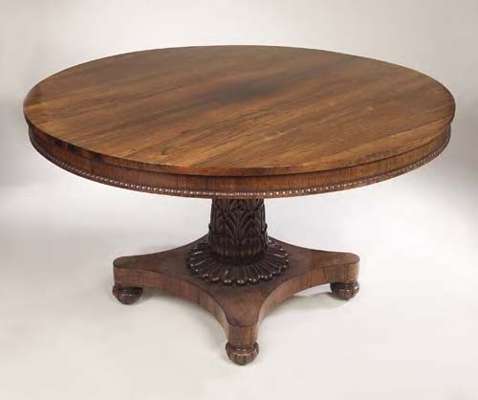 the circular top with bead and reel frieze raised on leaf carved turned column and concave quadriform base with carved bun feet and sunk castors