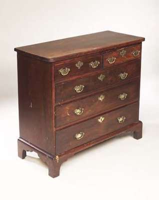 the rounded rectangular top above two short over three long graduated drawers raised on bracket feet