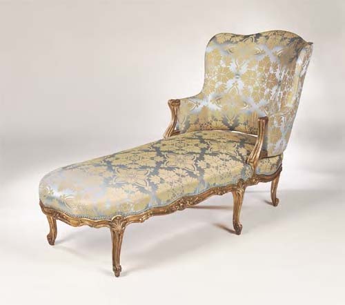 of typical form, the moulded giltwood frame enclosing buttoned silk upholstery, the whole raised on carved and moulded cabriole legs