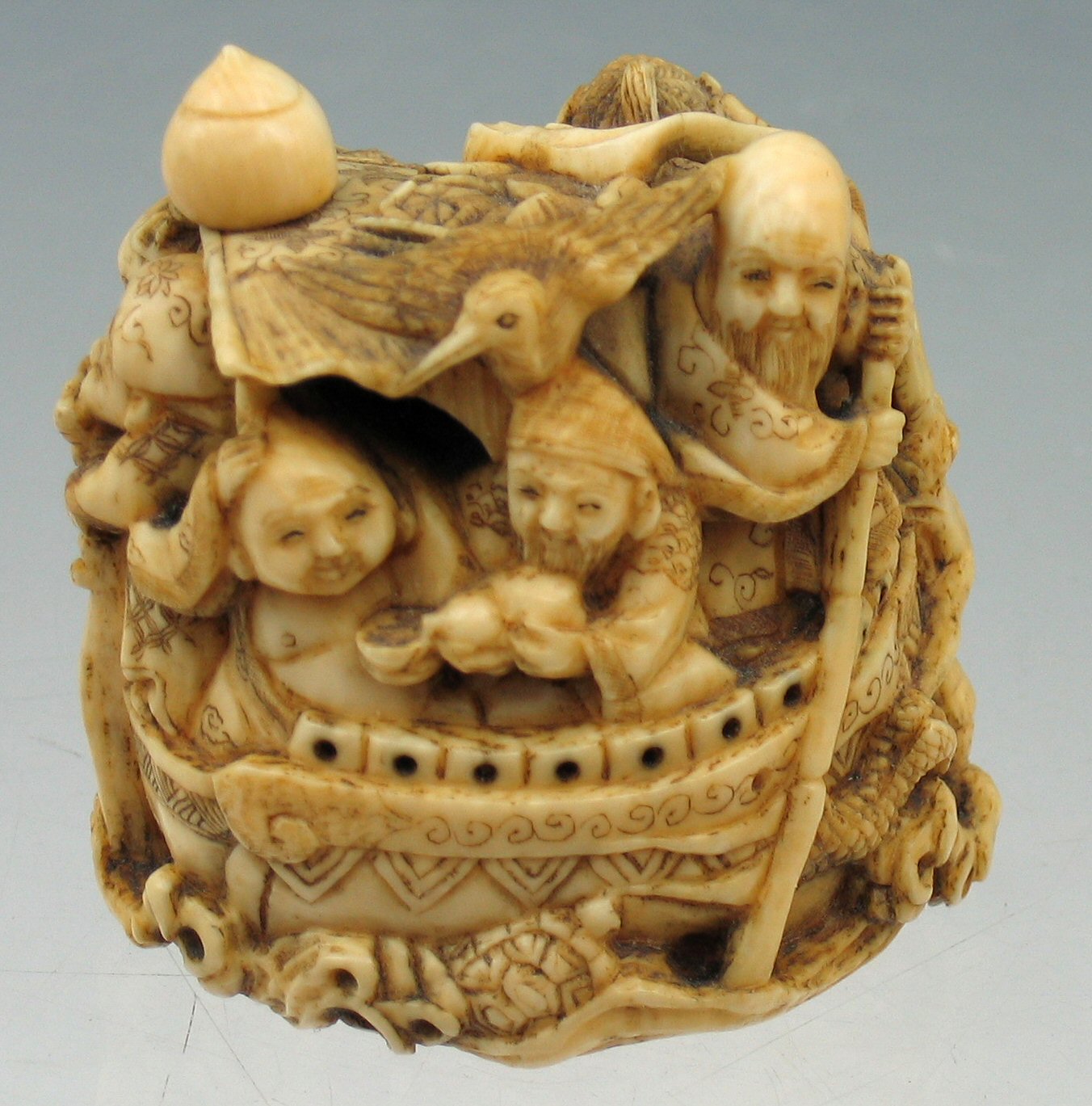 modelled as a tightly knit group of men in a boat, the prow in the form of an oni, with fish and a turtle to the outside, the base carved with waves,inset red seal mark, signed'