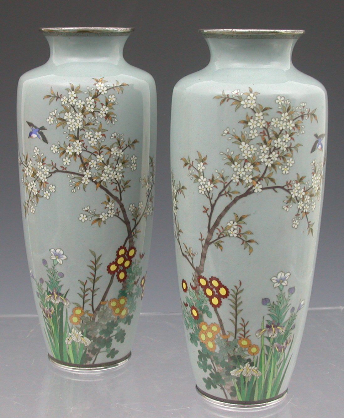 each with flaring neck above shouldered tapering body, depicting a bird flying near prunus blossom, above other blooms, on a pale grey ground (2)