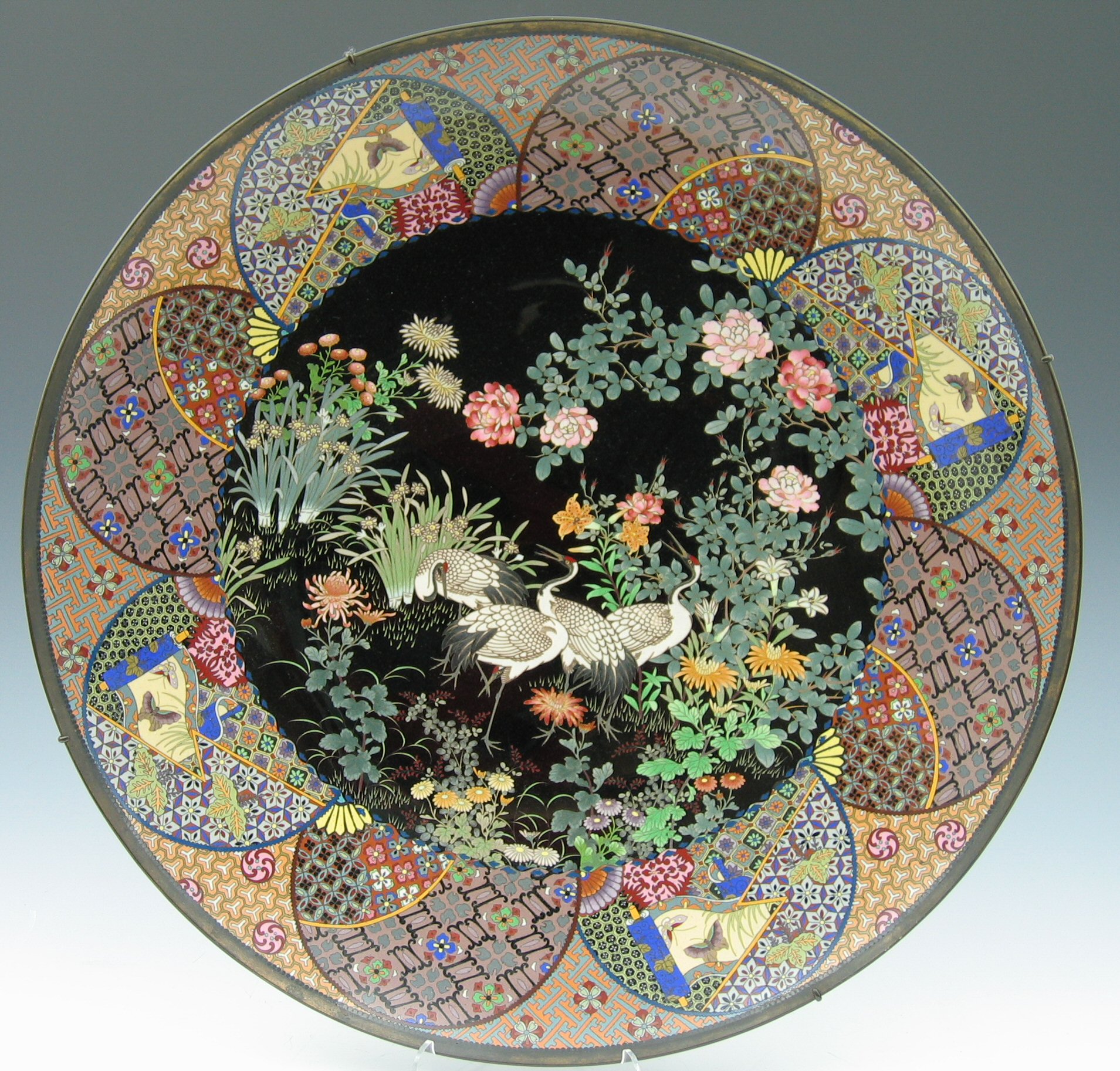 with wide border of trellis work, inset with semi-circular panels of stylised flowers, foliage and butterflies, the well decorated with storks in a floral landscape, on a black ground, the underside with allover scrolling cloisonne design
