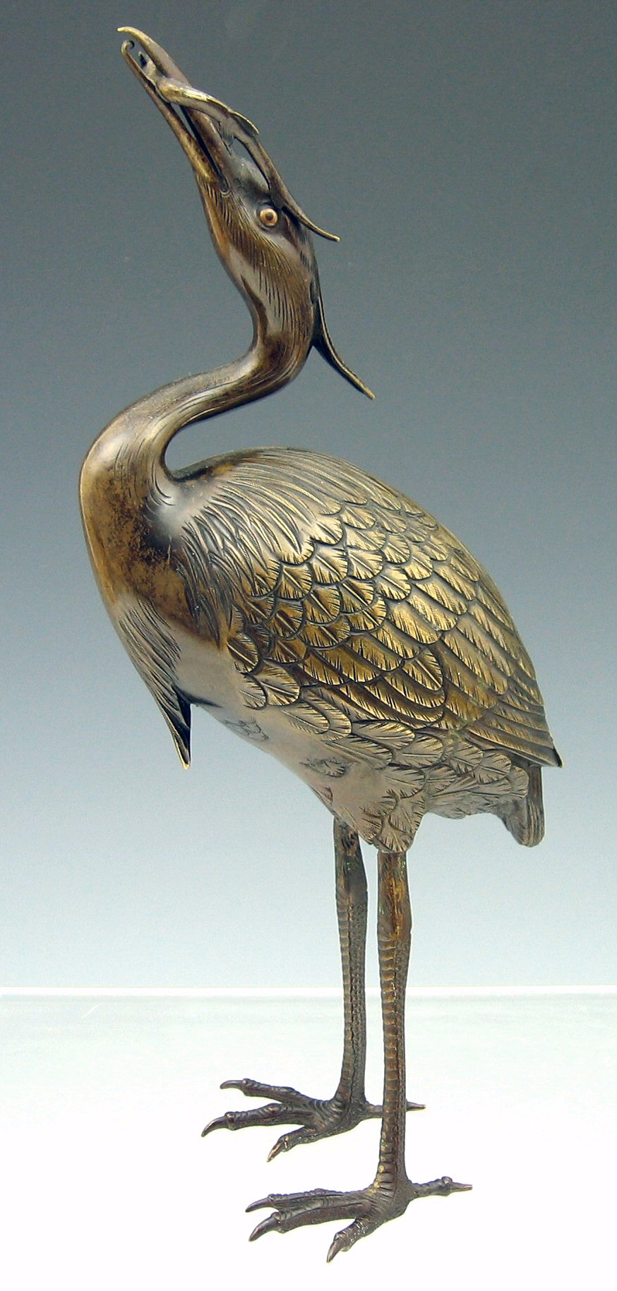 modelled with head pointing upwards and with a fish in its beak, well textured feather body on well modelled claw feet