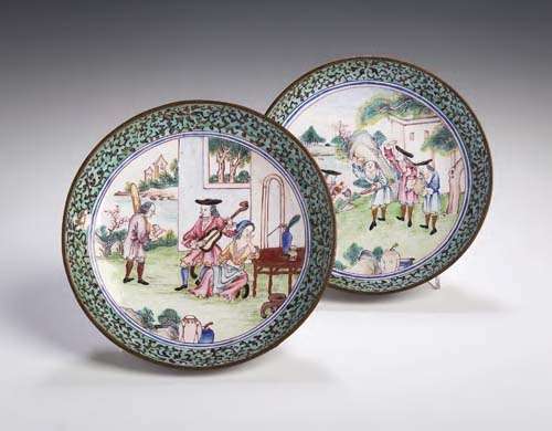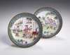 A pair of Canton polychrome enamel circular footed plates, 18th century,
