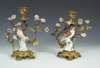 each with acanthus cast sconce above floral leafy branches, the scrolled base with a song bird seated on a tree trunk, blue painted mark (2)