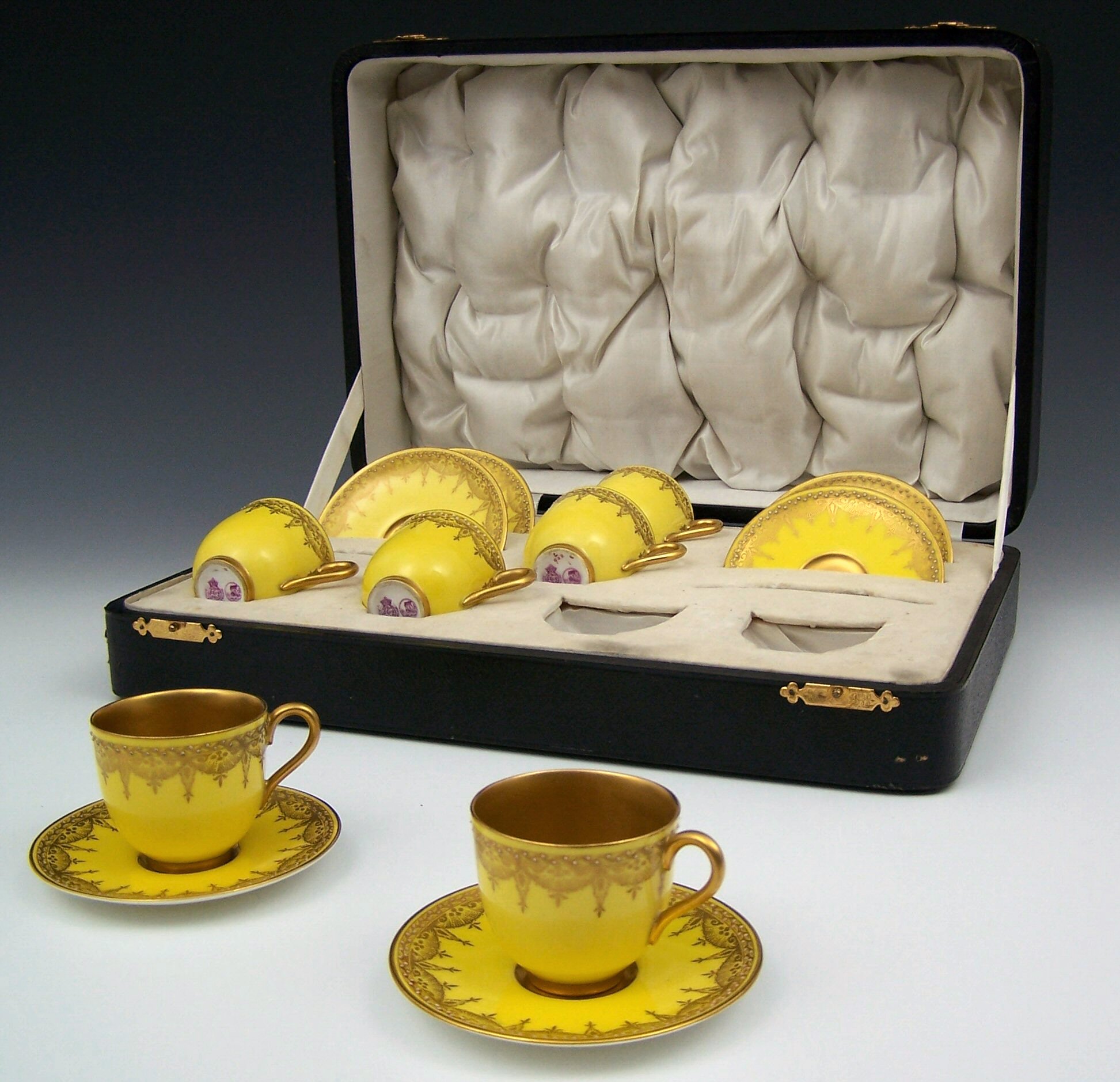 decorated in bright yellow with gilt shell and swag decoration with white jewelling ,comprising: six coffee cups, each with gilt handle and interior; and six saucers, each with gilt well, puce printed mark, date code for 1915, and additional puce printed mark of a Viking long boat, in a fitted black leather case