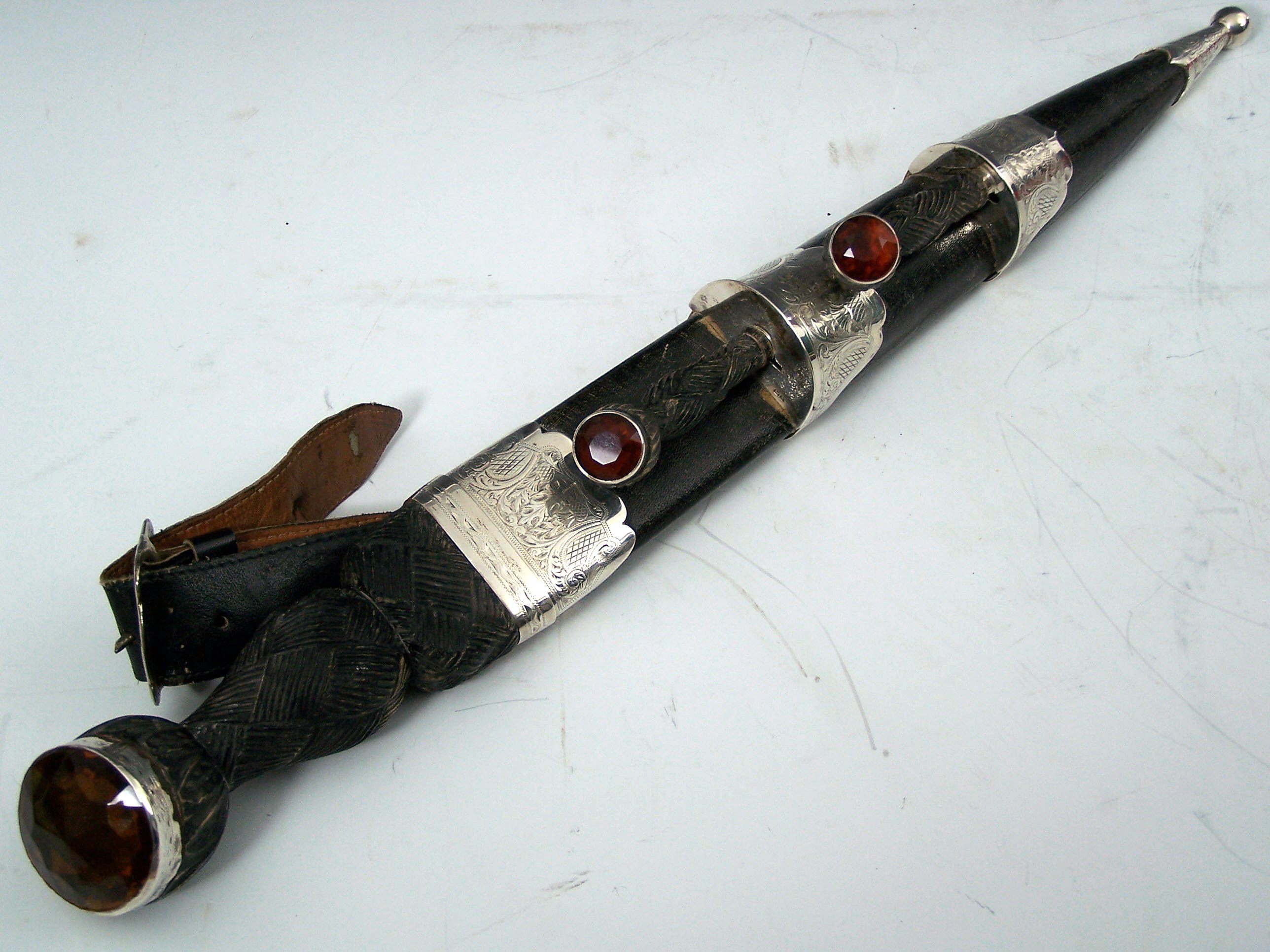 with carved root-wood grip surmounted by a coloured glass pommel of traditional form, the single edge blade with corrosion on the front edge of the blade, the back edge with highly decorated cuts and scrolls, in silver mounted black leather scabbard with bye knife and fork decorated en-suite with the dirk. Hall marks for Chester 1922