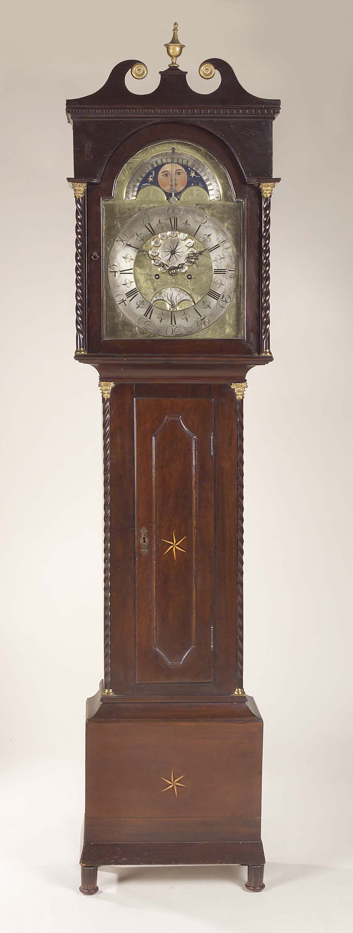 the twin train movement with anchor escapement striking on a bell, the incised arched brass dial with silvered chapter ring and subsidiary seconds dial and date aperture, incorporating moonphase with tidal dial indicating High Water in Leith, the hood with swan neck pediment and wrythen columns, panelled trunk door with similar columns, base with plinth and turned feet