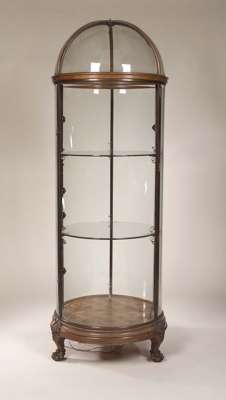 of circular form with bevelled glass door and panels in bronze frames, with domed wooden framed top and bevelled glass adjustable shelves, the base with parquetry floor and three squat shell carved cabriole legs with ball and claw feet, second set of fabric covered solid shelves