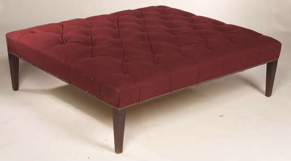 modern, the buttoned stuffover burgundy baize seat raised on square section tapered mahogany legs
