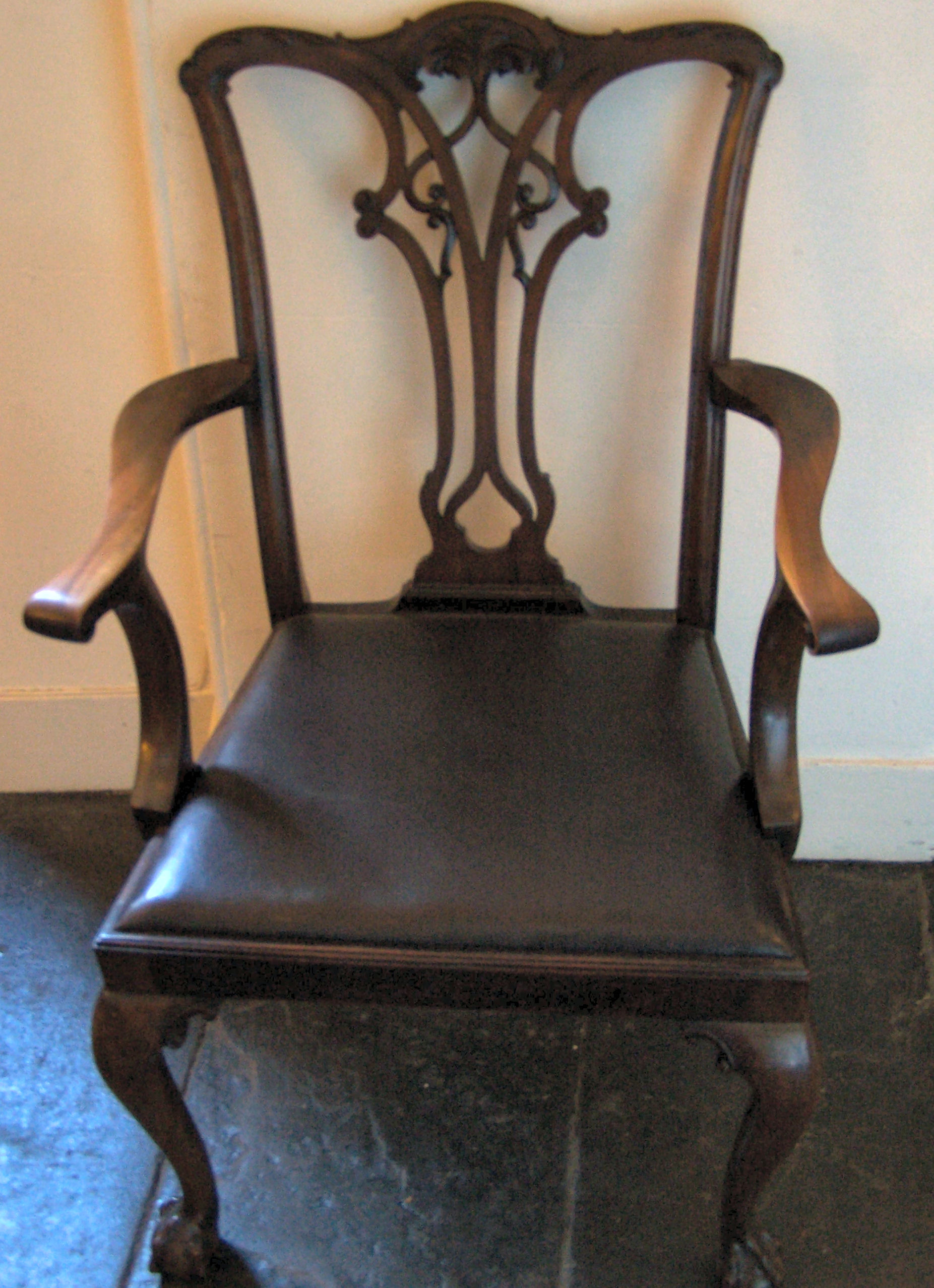 including two carvers, each with pierced interlaced splat and leaf carved top rail above drop in leather squab, cabriole legs with ball and claw feet