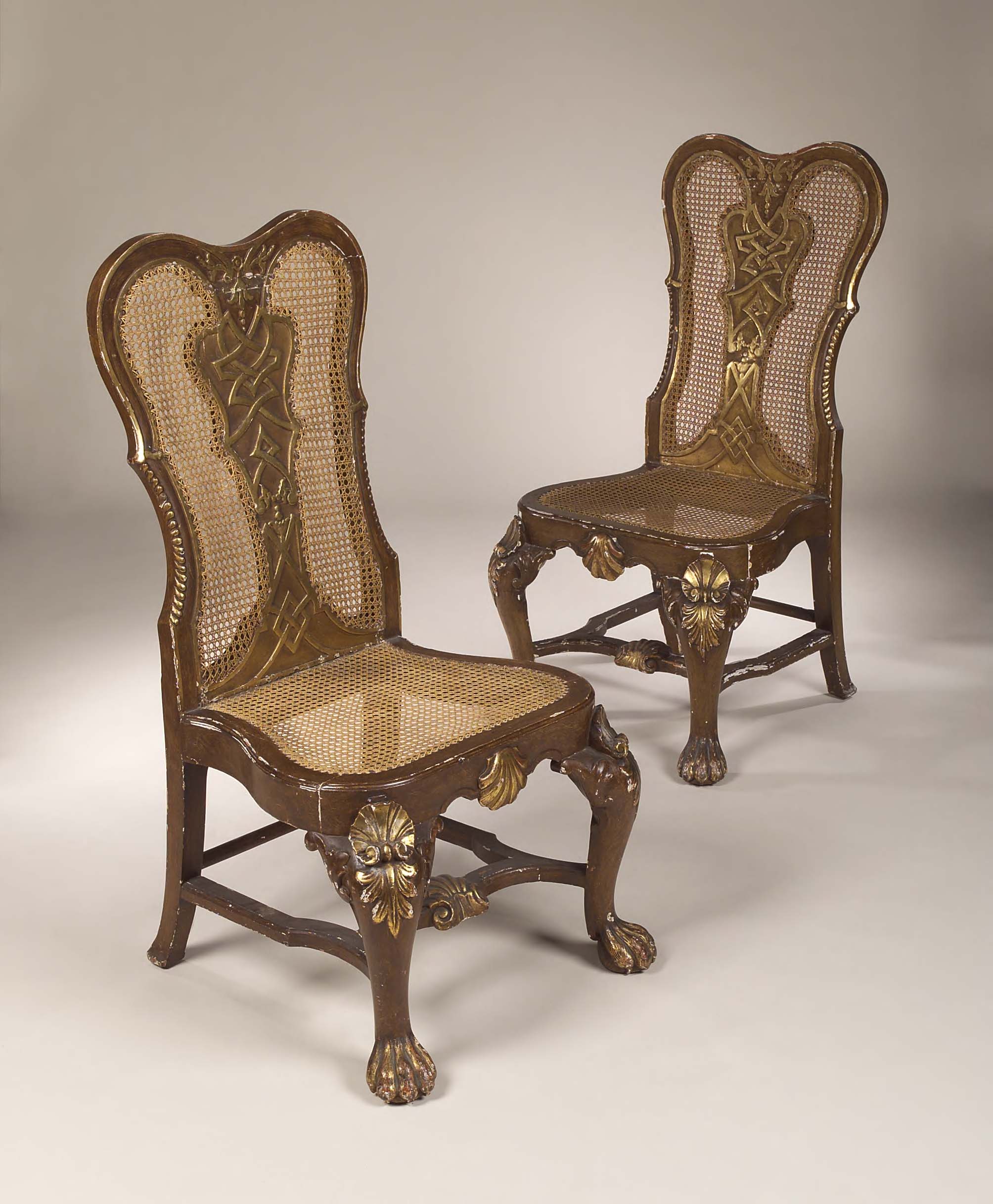 in the George I manner, each with shaped back with strapwork splat flanked by caned panels above waisted caned seat on shell carved cabriole legs with paw feet, linked by stretchers (12)